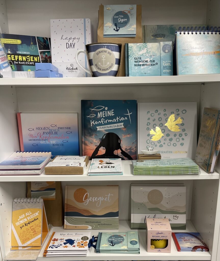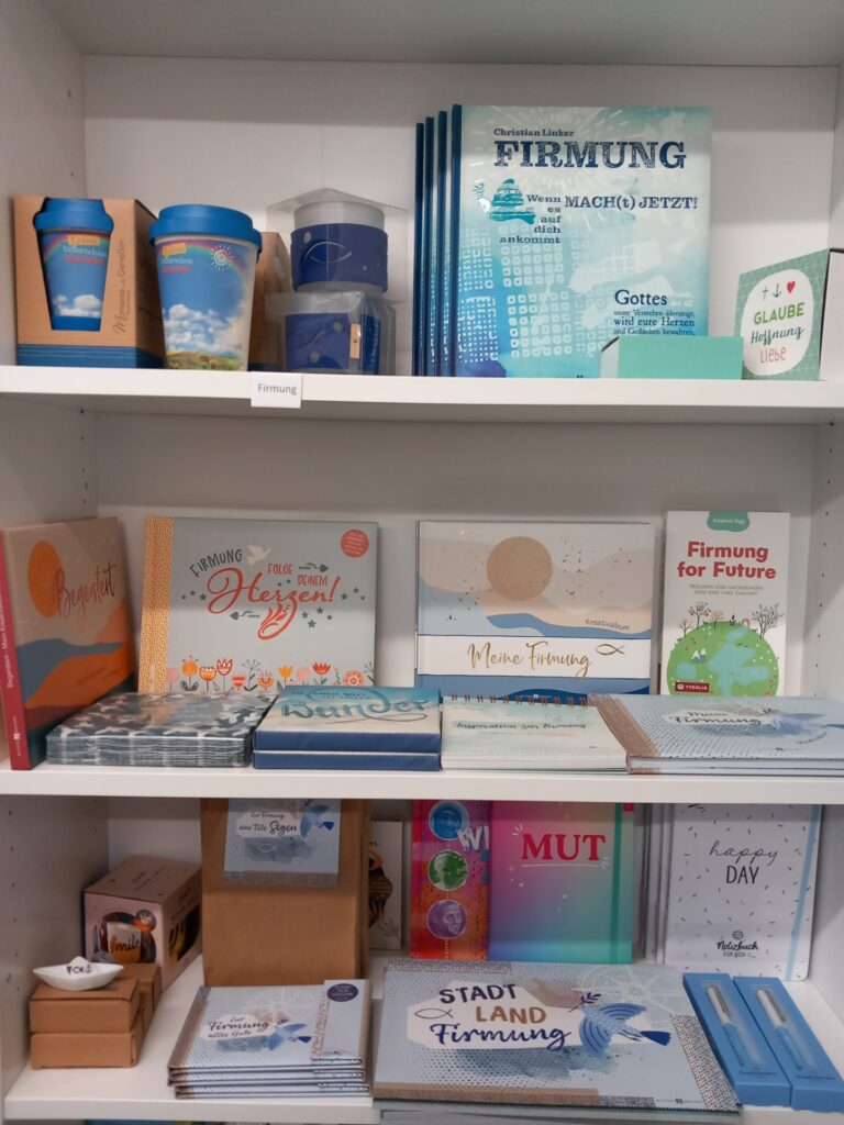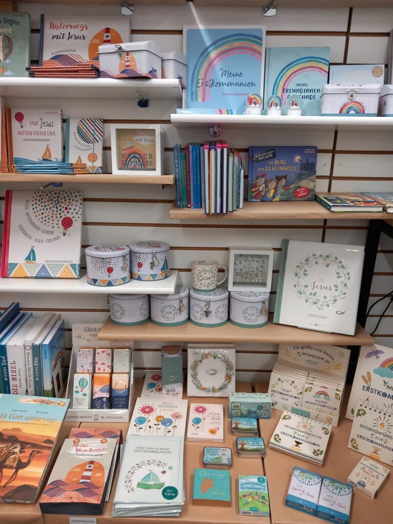 z. B. Kinderbibeln, Erinnerungsalben, Gold- und Silberkreuzchen, Geschenkbücher, Karten und vieles mehr. Kommen Sie vorbei und lassen Sie sich beraten.